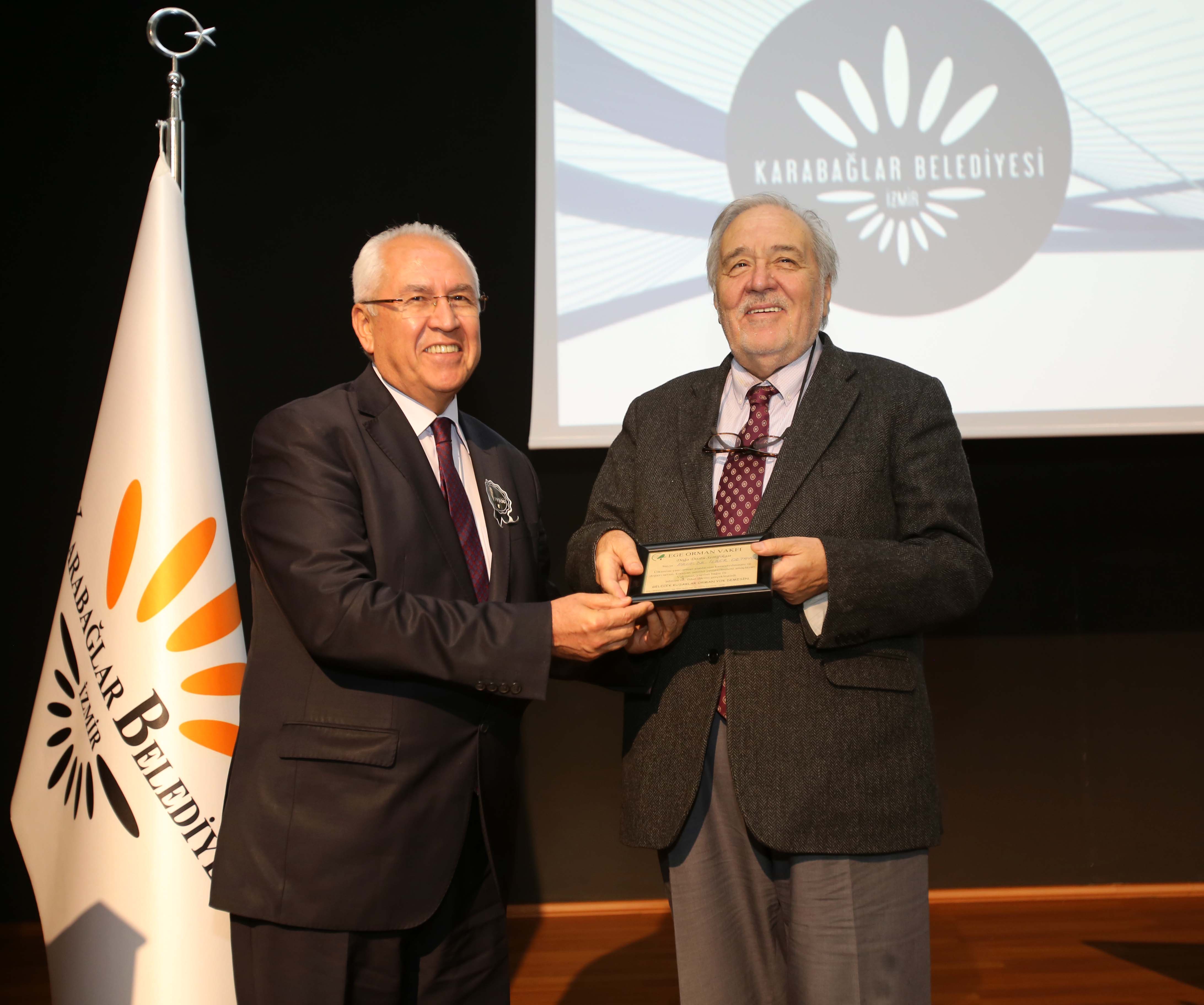 Söyleşi sonunda Başkan Selvitopu Prof. Dr. İlber Ortaylı’ya, Karabağlar’daki mobilya ustalarının el işiyle ürettikleri oyma sandık ve fidan dikim sertifikası armağan etti.