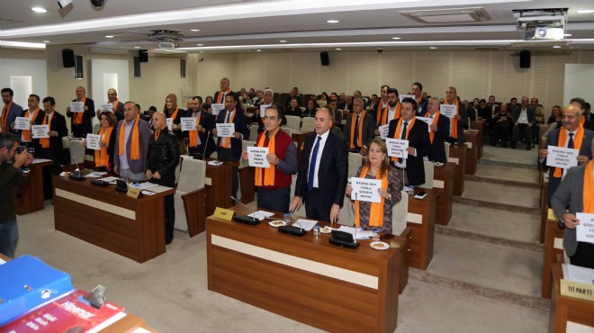 Karabağlar Belediye Meclisi’nin aralık ayı ilk oturumunda, mecliste grubu bulunan siyasi partilerin temsilcileri kadına yönelik şiddeti protesto etti. 25 Kasım’ın Kadına Yönelik Şiddete Karşı Uluslararası Mücadele Günü olması nedeniyle boyunlarına turuncu renk atkı takan meclis üyeleri, ellerinde de “Kadına her türlü şiddete hayır” içerikli döviz taşıdılar.