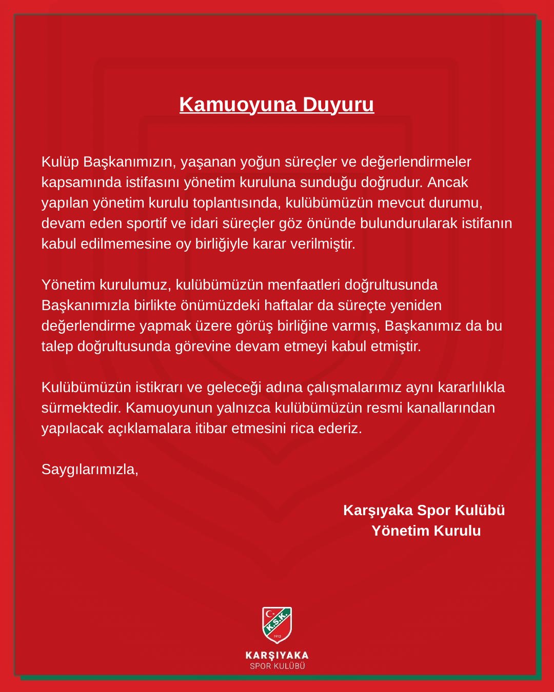 Karşıyaka Spor Kulübü Yönetim Kurulu, Başkan Aygün Cicibaş’ın sunduğu istifayı kabul etmeyerek, önümüzdeki haftalarda sürecin yeniden değerlendirilmesine karar verdi.