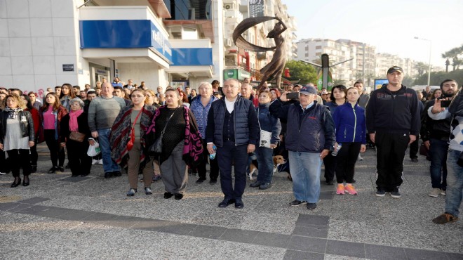 Siren ve korna sesleri ilçenin dört köşesinde yankılanırken, duygu dolu anlar da yaşandı. 83 yaşındaki Saime Alçıtepe, Foça’dan getirdiği kasımpatıları Atatürk heykeline bıraktı.