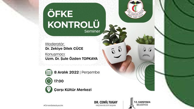 Karşıyaka Belediyesi, Türk Tabipler Birliği İzmir Tabip Odası iş birliğiyle 8 Aralık Perşembe günü “Öfke Kontrolü Semineri” düzenleyecek. Uzm. Dr. Şule Özden Topkaya’nın konuşmacı olarak katılacağı seminer, Dr. Zekiye Dilek Cüce’nin moderatörlüğünde gerçekleşecek. Çarşı Kültür Merkezi’nde saat 17.00’da başlayacak etkinlik herkese açık ve ücretsiz olacak.
