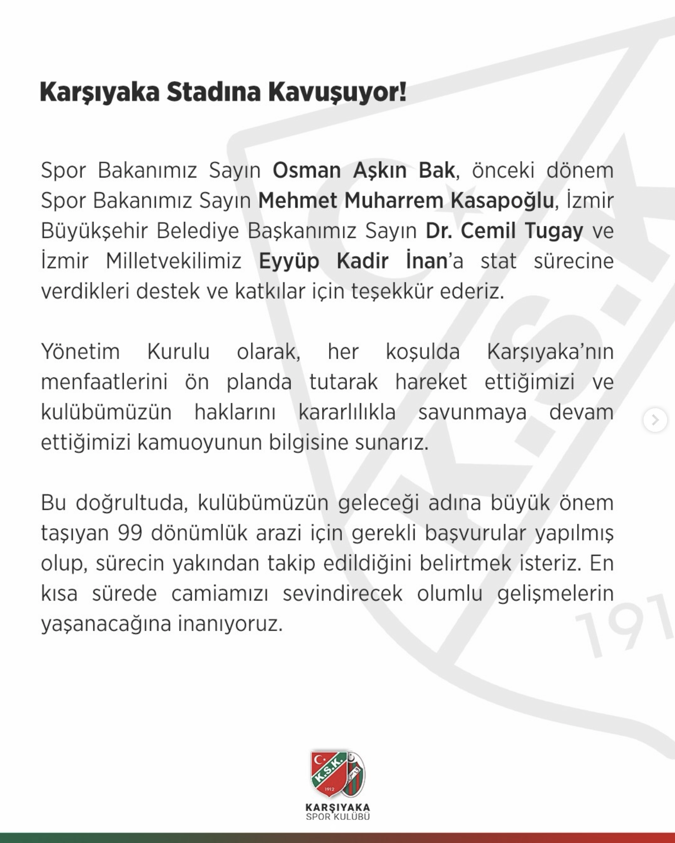 Gelinen bu noktada; Karşıyaka Spor Kulübü, büyük Karşıyaka taraftarı ve camiası olarak gözümüz ve kulağımız Sayın Bakanlık’tadır. Karşıyaka’nın yıllardır özlemini duyduğu stadın hayata geçirilmesi adına bekleyen imza sürecinin hızlandırılmasını camiamız adına önemle bekliyoruz.