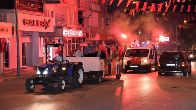 Bayramın akşam programı ayağında ise Belediye Başkanı Rıdvan Karakayalı, CHP İlçe Başkanı Ahmet Cemil Balyeli, İYİ Parti İlçe Başkanı Nizamettin Yılmaz ile birlikte üstü açık gezici fener alayı aracı ile bando takımı eşliğinde şehir merkezinde tur atarak balkonlarından bayramı kutlayan vatandaşları tek tek selamladı. Ardından şehir merkezindeki Atatürk Anıtı’nda meşaleli ve gökyüzü tarayıcıları ile ışıklı gösteri yapıldı. Vatandaşların kendi araçları ile konvoya katıldığı kutlamalar akşam 21:00’a kadar sürdü.