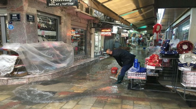 İzmir'de geceden itibaren etkili olan sağanak yağmur nedeniyle kentin birçok noktasında olumsuzluklar meydana gelirken, Tarihi Kemeraltı Çarşısı'nda birçok dükkanı su bastı.