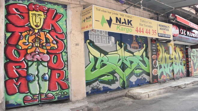 Çeşitli sanatçıların, iş yerlerinin kepenklerine çizdiği grafitiler, renkli görüntüler oluşturdu.
