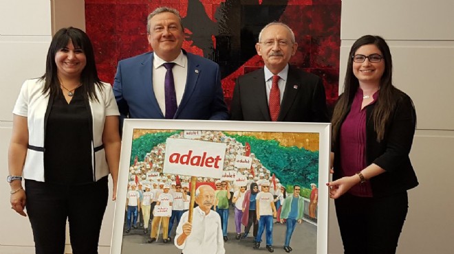 GERÇEKİZMİR - Dikili Belediye Başkanı Mustafa Tosun, Dikili ilçe kadın ve gençlik kolları başkanlarıyla, CHP Genel Başkanı Kemal Kılıçdaroğlu'na nezaket ziyareti gerçekleştirdi. Sıcak bir ortama sahne olan ziyarette Başkan Tosun, Kılıçdaroğlu'na Adalet Yürüyüşü'nün resmedildiği yağlı boya çalışmasını hediye etti.