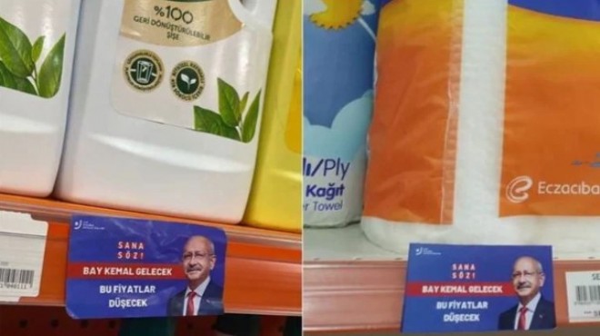 Gıda ve temizlik ürünleri reyonlarındaki etiketlerde “Sana söz! Bay Kemal gelecek bu fiyatlar düşecek' ibaresi yer aldı.