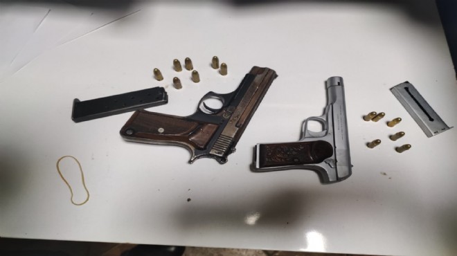 İZMİR - Konak ilçesinde kimlik sorgusu için durdurulan bir kişinin davranışlarından şüphelenen polis ekiplerinin çevrede yaptığı araştırmada 2 tabanca ile 13 mermi ele geçirildi. Silahların ait olduğu belirlenen kişi gözaltına alındı.