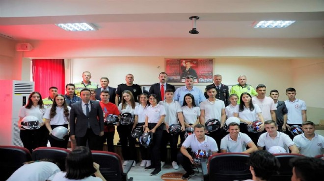 Kınık Belediyesi tarafından düzenlenen programda, eğitime katılan öğrencilere Kınık Belediye Başkanı Dr. Sadık Doğruer tarafından kask hediye edildi.