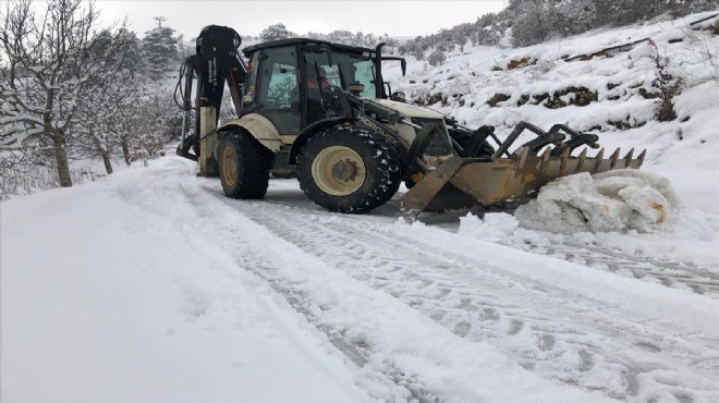 İzmir'in Kiraz ilçesinde kar yağışı nedeniyle ulaşıma kapanan 13 mahallede kar temizleme çalışması yapılıyor.