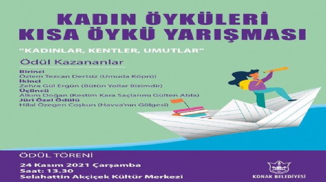 Konak Belediyesi’nin, kadınların kendi öykülerini dile getirebilecekleri, kendi sesini duyurabilecekleri, bu amaçla yalnızca kadınların katılımına açık olarak düzenlediği “Kadın Öyküleri Kısa Öykü Yarışması sonuçları açıklandı. “Kadınlar, Kentler, Umutlar” başlığı altında yapılan Kısa Öykü Yarışması’na Türkiye’nin dört bir yanından 18 yaş üstü kadın katılımcılar 670 eser ile yer aldılar. Kadınların kendi öykülerini dile getirebilmelerini sağlamanın yanında kadın yazarları edebiyat dünyasına kazandırmayı da hedefleyen “Kadın Öyküleri” yarışmasında Özlem Tezcan Dertsiz “Umuda Köprü” eseriyle birinciliğe layık görüldü.