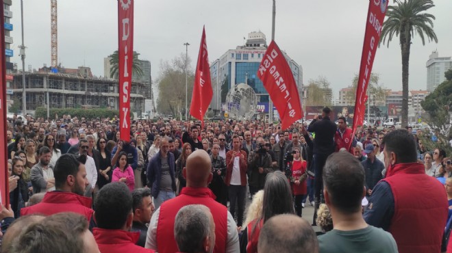 Sabah saatlerinde Konak Belediyesi’nin Basmane’deki hizmet binası önünde toplanan işçiler sloganlar attı, siyah giyinerek belediyeyi protesto etti.