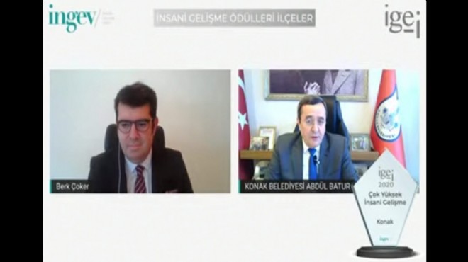 İNGEV, “İnsani Gelişme Endeksi” çalışmasında, “Çok Yüksek İnsani Gelişme” performansı gösteren ilçe belediyelerini, çevrimiçi düzenlenen bir törenle açıklayarak, ödüllerini dağıttı. Konak Belediyesi, 2020 yılında yaptığı çalışmaları ve sunduğu hizmetleri, 7 ana başlık altında incelemeye alınan 188 ilçe belediyesi arasında 11. olarak, en yüksek insani gelişim gösteren belediyelerin yer aldığı “Çok Yüksek İnsani Gelişme” kategorisine girdi. Konak Belediyesi’nin ödülünü, törene makam odasından bağlanan Konak Belediye Başkanı Abdül Batur aldı.