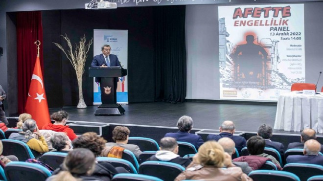 Panel açılışında konuşma yapan TMMOB İzmir İl Koordinasyon Kurulu İzmir Tabip Odası ve İzmir Barosu sözcüsü Çevre Mühendisi Helil İnan Kınay da “Meslek odaları olarak kendi alanlarımızda bilim, mühendislik ve planlama ışığında sağlıklı kentler yaratabilmek için mücadelemizi yürütüyoruz. Ülkemizdeki afetlerde çok acı sonuçlarla, ağır bedeller ödüyoruz. TMMOB İl Koordinasyon Kurulu olarak, kentimizdeki tüm afet süreçlerine yönelik olarak üç meslek odasının ortak komisyonuyla yaptığımız çalışmaların kente nasıl yayılacağı, mücadeleyi nasıl büyüteceği üzerinden değerlendirme yapmaya çalıştık. Bunun en önemli ekseni kentli ile birlikte olmak, dolayısıyla bu panelde Konak Belediyesi ve Konak Kent Konseyi ile birlikte aslında afeti, afetlere karşı engelli olduğumuz süreçte engelli bireylerimizin çözümü ve sorunları hep beraber değerlendirmek istiyoruz” dedi.