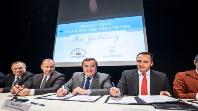 Konak Belediyesi memur ve işçilerini kapsayan toplu iş sözleşmelerinin imza törenleri art arda yapıldı. Konak Belediyesi ve Tüm Yerel-Sen İzmir 2 No’lu Şube arasındaki toplu iş sözleşmesi imza töreni Selahattin Akçiçek Kültür Merkezi’nde gerçekleştirildi. Törene Konak Belediye Başkanı Abdül Batur’la birlikte CHP Parti Meclisi Üyesi ve İstanbul Milletvekili Gökan Zeybek, CHP Parti Meclisi Üyesi ve İzmir Milletvekili Ednan Arslan, CHP İzmir İl Başkan Vekili Münir Sirhan Özel ve il yöneticileri, CHP Konak İlçe Başkanı Akın Küçükoğullarından ve yönetimi, Tüm Yerel-Sen kurucu Başkanı Vicdan Baykara, Tüm Yerel-Sen Genel Sosyal ve Dış İlişkiler Sekreteri Tamer Yiğit Güler, Tüm Yerel-Sen İzmir 2 No’lu Şube Başkanı Ömer Eşki ve yönetim kurulu üyeleri, Tüm Yerel-Sen İzmir 1 No’lu Şube Başkanı Yücel Yılbaşı, Tüm Yerel-Sen işyeri temsilcileri, Konak Belediyesi Meclis Üyeleri, belediye bürokratları ve belediye memurları katıldı. Şenlik havasında gerçekleşen törenin ardından Konak Belediyesi ile DİSK’e bağlı Genel-İş İzmir 5 No’lu Şube arasındaki toplu iş sözleşmesi imza töreni için hep birlikte belediyenin Gürçeşme’deki Temizlik İşleri Müdürlüğü şantiyesine geçildi. Belediye işçilerinin halaylar çektiği törene DİSK Genel-İş Sendikası Genel Başkanı Remzi Çalışkan, Genel-İş Sendikası Genel Sekreteri Şükret Sevgener, Genel-İş Toplu Sözleşmeler Daire Başkanı Çetin Çalışkan, Genel-İş Sendikası Örgütlenme Daire Başkanı Ali Haydar Kara, DİSK Ege Bölge Temsilcisi Memiş Sarı, Sosyal Demokrat Kamu İşverenleri Sendikası (Sodemsen) Genel Sekreteri Cahit Korkmaz, Genel-İş 5 No’lu Şube Başkanı Ahmet Savaş Aras ve 1,2,3,4,6,7,8 ve 9 No’lu şubelerin başkanları, Genel-İş 5 No’lu Şubeye bağlı Konak, Karabağlar, Buca ve Gaziemir Belediyeleri işyeri temsilcileri ve belediye işçileri katıldı.