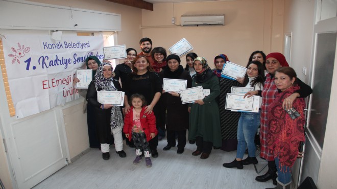 İzmir’in merkez ilçesi Konak’ta çeşitli sebeplerden ötürü iş yaşamına katılamayan kadınlara yönelik başlatılan mesleki eğitim kursları mezun vermeyi sürdürüyor. Konak Belediyesi’nce açılan ücretsiz eğitimler sayesinde kadınlar iş sahibi olup, üretim sürecine katılıyor. Konak Belediyesi’nin destekleriyle iş yaşamının kapısını aralayan kadınlar arasına son olarak 1. Kadriye Mahallesi’nde hizmet veren Rehberlik ve Dayanışma Merkezi’nde Sosyal Girişimcilik Eğitimi’ne katılan 12 kursiyer katıldı. 6 haftalık eğitimi başarıyla tamamlayan kursiyerlere sertifikaları düzenlenen törenle verildi. Projenin yürütüldüğü 1. Kadriye Rehberlik ve Danışmanlık Merkezi’nde gerçekleşen törene kursiyer kadınların yanı sıra aileleri ve diğer kursiyerler katıldı.
