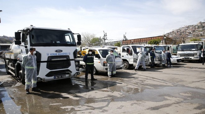 ?Salgının yayıldığı yaklaşık bir aylık zaman diliminde Konak Belediyesi ekipleri, 4 bin 420 kilogram dezenfektan kullandı. Sokak ve caddelerde yıkama ve temizlik çalışmaları gerçekleştirilirken meydanlar ve pazaryerleri gibi kamuya açık alanlar da yıkandı ve dezenfekte edildi. Park ve Bahçeler ekipleri de ilçedeki parklardan oturma gruplarını kaldırarak sosyal mesafe için önlem aldı ve parkların temizlik ve dezenfektasyonunu gerçekleştirdi. Öte yandan ilçedeki kamu kurum ve kuruluşları ile sayıları yaklaşık 300 olan eczane, tıbbi malzeme ve sağlık malzemeleri satış yerinde de düzenli olarak dezenfektasyon işlemi yapıldı. Öncelikle Konak Belediyesi hizmet binaları, birimleri ve araçları olmak üzere muhtarlık binaları, hastaneler, aile sağlığı merkezleri, ibadethaneler, semt ve kültür merkezleri, televizyon, dergi, gazete gibi medya kuruluşları binaları ve ofisleri, siyasi parti merkezleri, emniyet birimleri gibi kurum ve kuruluşlarda da dezenfektasyon yapıldı. Şehir genelinde gerçekleştirilen tüm temizlik ve dezenfektasyon çalışmaları düzenli aralıklarla ve hız kesmeden devam ediyor.