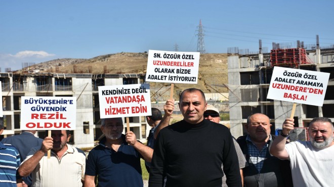 İzmir Büyükşehir Belediyesi iştiraki İZBETON'a yönelik soruşturmada kooperatiflerdeki usulsüzlük iddialarıyla ilgili açılan, eski Büyükşehir Belediye Başkanı Tunç Soyer ve CHP İl Başkanı Şenol Aslanoğlu'nun da aralarında bulunduğu 11'i tutuklu 65 kişinin yargılandığı dava süreci devam ederken, İzmir Büyükşehir Belediyesi'nin Karabağlar Uzundere Mahallesi'ndeki 32 hektarlık alanda yürüttüğü kentsel dönüşüm çalışmaları kapsamında, 15 yıldır kentsel dönüşüm beklediklerini belirten hak sahipleri bir araya geldi. Topluluk, 'Özgür Özel, adalet aramaya Uzundere'den başla', '15 yıl oldu adalet Uzundere'ye gelmedi', 'Büyükşehir'e güvendik rezil olduk', 'Kendinize değil vatandaşa hizmet edin' yazılı dövizler taşıdı.