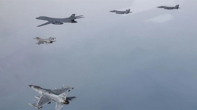 Uzakdoğu'da askeri gövde gösterisi. Güney Kore semalarında iki adet Amerikan B1 bombardıman uçağına, Güney Kore'nin F-35'leri, Amerikan ordusunun F-16'ları eşlik etti.