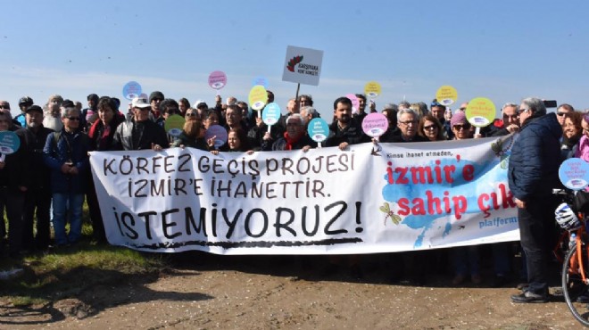 'İzmir’e Sahip Çık Platformu' üyesi yaklaşık 100 kişi, kentin iki yakasının otoyol ve raylı sistemle birleştirilmesinin öngörüldüğü 'Körfez Geçişi Projesi' için verilen ÇED olumlu raporunun iptali istemiyle açılan davada bilirkişi heyetinin keşif yaptığı gün basın açıklaması düzenledi.