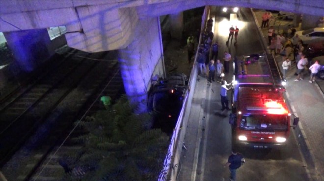 İzmir'in Bayraklı ilçesinde viyadükten demir yoluna düşen hafif ticari araçtaki 1 kişi öldü, 2'si ağır 5 kişi yaralandı.