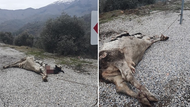 İzmir'in Beydağ ilçesinde ayaklarından iple trafik levhalarına bağlanmış inek telef olmuş halde bulundu.