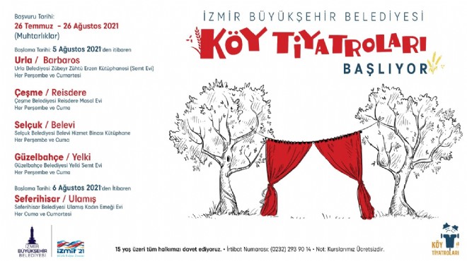 İzmir Büyükşehir Belediyesi beş ilçede ilk kez amatör yeteneklere Köy Tiyatroları’nda eğitim vermeye hazırlanıyor. Seferihisar-Ulamış, Selçuk-Belevi, Urla-Barbaros, Güzelbahçe-Yelki ve Çeşme-Reisdere’de başlayacak eğitimlere 15 yaş üstü herkes katılabilecek. 5 ay sürecek eğitimler 5 Ağustos’tan itibaren başlasa da başvurular 26 Ağustos’a kadar muhtarlıklardan yapılabilecek.