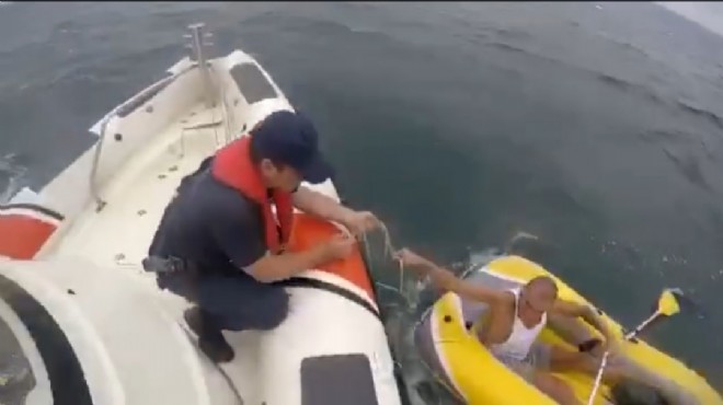 ?Yassıca Adası önlerinde saat 14.45 sıralarında bir kişinin denizde lastik botla sürüklendiği ihbarını alan Sahil Güvenlik Komutanlığı ekipleri, söz konusu bölgeye gitti. Ekipler, tek kişilik bot içerisinde, dalgaların arasında elindeki küreklerle denizde ilerlemeye çalışan bir kişiyi fark etti. Bota yanaşan ekipler, Süleyman Emir Kırmızı'yı tekneye çıkardı. O anlar, cep telefonuyla saniye saniye kaydedildi. İç çamaşırlarıyla olduğu belirlenen ve panikle Sahil Güvenlik teknesine çıkan Kırmızı, temel ihtiyaçlarının giderilmesinin ardından karaya çıkarıldı. (DHA)