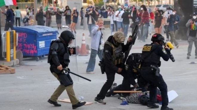 Los Angeles'ta yüzlerce gösterici, kentin çeşitli bölgelerinde düzensiz göçmenlere karşı operasyonlar düzenleyen Gümrük Muhafaza Dairesi (ICE) ekiplerine karşı protesto başlatmıştı. (AA)