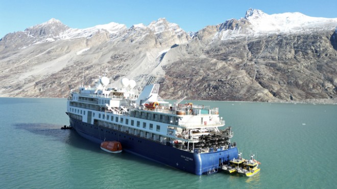 Bloomberg'in haberine göre, Grönland’ın kuzeydoğusunda karaya oturan lüks yolcu gemisinin, gelgitten faydalanarak çamurlu deniz tabanından kurtulmaya yönelik iki girişimi başarısız oldu.