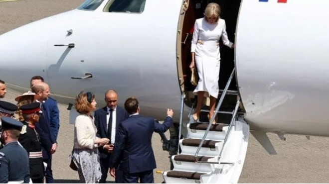 Macron, eşi Brigitte uçaktan inerken ona yardım etmek için nazikçe elini uzattı ancak Brigitte, eşinin elini tutmak yerine merdiven korkuluğuna tutunmayı tercih etti.