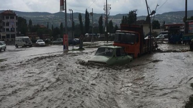 İlçe merkezine ilerleyen sel suları bazı araçları sürüklerken, bölgedeki iş yeri ve evleri su bastı.