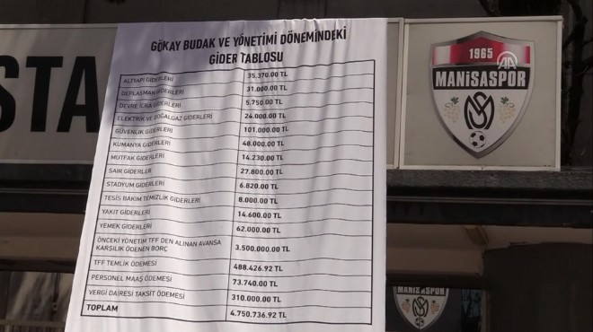 Yaşadığı maddi sorunlar nedeniyle zor günler geçiren ve önümüzdeki sezon TFF 2. Lig'de mücadele edecek Grandmedical Manisaspor'un kulüp başkanı Gökay Budak, kulübün gelir ve gider tablosunun yer aldığı bir pankart hazırlatarak 19 Mayıs Stadı'nın kapısına astırdı.