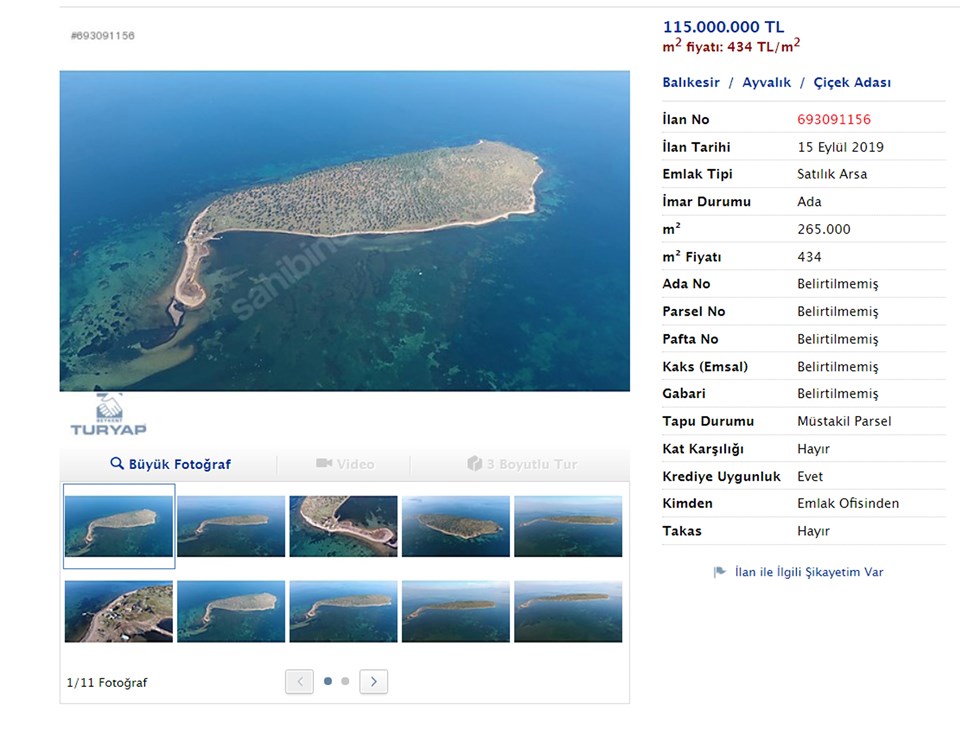 Balıkesir'in 22 adasından biri olan Ayvalık ilçesinde bahar mevsiminde sarı ve beyaz 'koyun gözü' cinsi nergis çiçekleri açan ve adını buradan alan Çiçek Adası da 15 Eylül'de internet üzerinden satışa çıkarıldı. İlk kez 2002 yılında satışa çıkarılan Çiçek Adası, Ayvalık ve Gömeç ilçeleri açıklarında bulunuyor. Karaya 230 metre mesafede, 267 bin metrekare alana sahip Çiçek Adası, 115 milyon liraya satışa çıkarıldı. İçinde taban oturumu 450 metrekare 3 bina bulunan ada, Ayvalık'a 12 kilometre, Çanakkale- İzmir yoluna ise 3,5 kilometre mesafede. 4 tatlı su kuyusunun da bulunduğu adada 2 bin zeytin ağacı, 3 bin çam ve muhtelif meyve ağaçları bulunuyor. Ada, Katrinli, Katerin ve Hatırlı ailelerinin özel mülkü konumunda. En yüksek noktası 22 metre olan ada alıcılarını bekliyor. (DHA)
