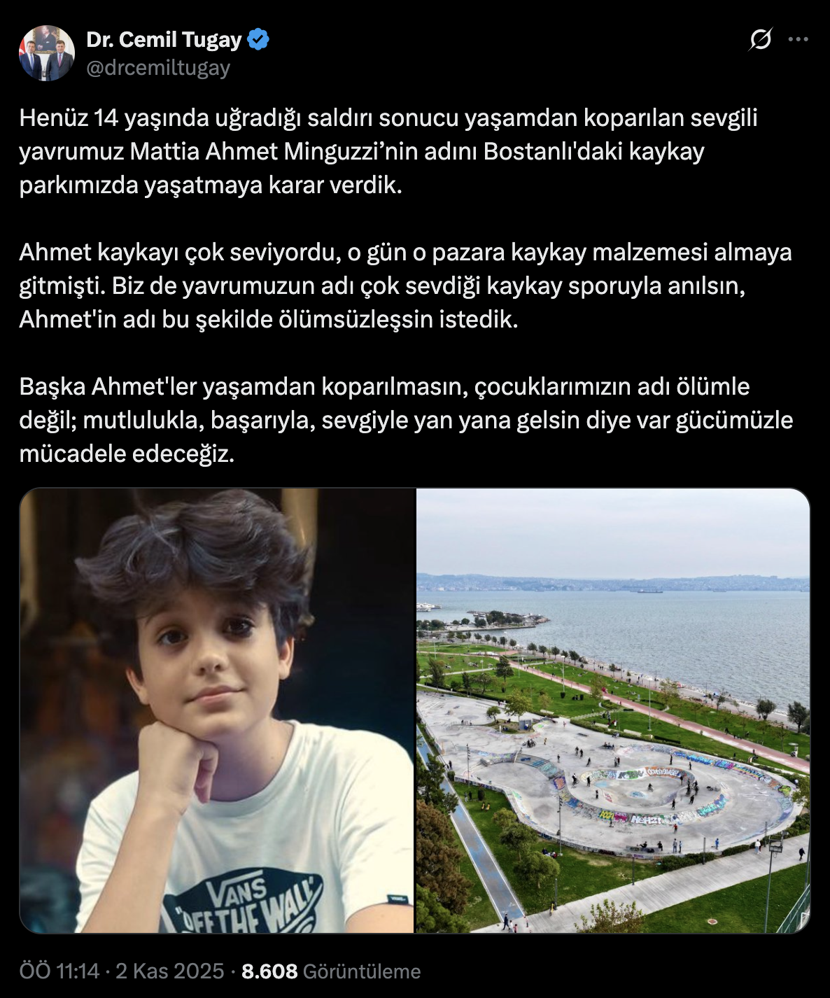 GERÇEKİZMİR - İzmir Büyükşehir Belediye Başkanı Dr. Cemil Tugay, 14 yaşında uğradığı saldırı sonucu hayatını kaybeden Mattia Ahmet Minguzzi’nin adının, Bostanlı’daki kaykay parkına verileceğini açıkladı.
