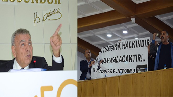 “Kültürpark halkındır halkın kalacak” platformun talebi üzerine Başkan Kocaoğlu oturumda usül gereği meclis üyeleri dışında kimsenin söz alamayacağını hatırlattı.