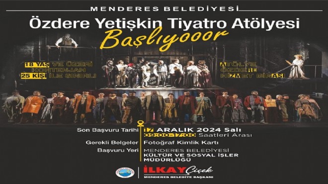 Menderes Belediyesi Özdere Yetişkin Tiyatro Atölyesi, tiyatroya ilgi duyan 18 yaş üstü vatandaşları bekliyor. Devam eden başvurular 17 Aralık Salı günü saat 17:00’da sona eriyor. Vatandaşların, fotoğraf ve kimlik kartları ile birlikte 09:00-17:00 saatleri içerisinde Menderes Belediyesi Kültür ve Sosyal İşler Müdürlüğü veya Özdere Hizmet Binası’na gelerek form doldurması gerekiyor. Kontenjanın 25 kişi olduğu ve hızla dolduğu belirtildi.