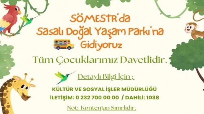 Menderes Belediyesi Kültür ve Sosyal İşler Müdürlüğü, ara tatilde çocuklar için gezi düzenleyecek. İzmir Doğal Yaşam Parkı’na (Sasalı Hayvanat Bahçesi) gerçekleştirilecek olan gezilere tüm çocuklar davet edildi. Kontenjanın sınırlı olduğu etkinlik için Kültür Sosyal İşler Müdürlüğü’ne bizzat müracaat ederek veya 0232 700 00 00’ı (dahili: 1038) arayarak kayıt yaptırılabilecek.