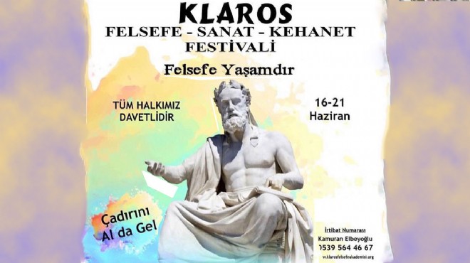 Menderes 16-21 Haziran tarihlerinde ise felsefe dolu bir festivale şahitlik edecek. 16 Haziran Perşembe Saat 11.00’de Klaros Antik Kenti’nde başlayacak festival, 3 gün boyunca Ahmetbeyli kamp alanında devam edecek. 17-21 Haziran’da Ahmetbeyli kamp alanına çadırlarıyla gelen felsefe severler, 37 kişilik uzman araştırmacı eğitmenler ve akademisyenlerden oluşan ekiple interaktif ve bilgilendirici sunumlara şahitlik edecekler. Çocuklara felsefe atölyesinden, sergilere; doğa yürüyüşlerinden, yoga etkinliğine birbirinden farklı etkinliklerin yer alacağı festivalde, katılımcılar sahne performanslarıyla da eğlenceli vakit geçirecekler.