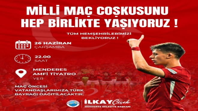 Bir üst tura çıkacak takımı belirleyecek kritik maç Menderes Belediyesi Amfi Tiyatro'da ki dev ekrana yansıtılacak. Maç öncesinde vatandaşlara Türk Bayrağı da Menderes Belediyesi tarafından ücretsiz dağıtılacak.