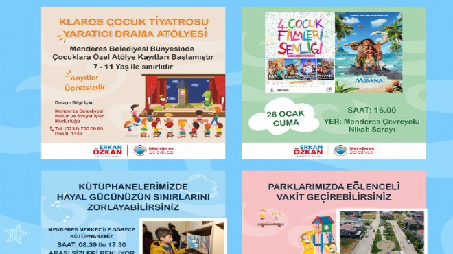 Hazırlanan program kapsamında Menderes Belediyesi Merkez Kütüphane ile Görece Kütüphanesi hayal gücünün sınırlarını zorlayacak çocuklar için kapılarını açarken, parklar başta olmak üzere belediyeye bağlı tüm tesisler çocukların hizmetinde olacak. İzmir Büyükşehir Belediyesi 4. Çocuk Filmleri Şenliği kapsamında ise 26 Ocak Cuma günü Menderes Belediyesi Nikah Sarayı ve Kongre Merkezi’nde Moana filmi çocuklarla buluşacak. Klaros Çocuk Tiyatrosu Yaratıcı Drama Atölyesi tarafından da tiyatro atölyesi gerçekleştirilecek. Atölyeye katılmak isteyen 7-11 yaş arası çocuklar Menderes Belediyesi Kültür ve Sosyal İşler Müdürlüğü’ne başvuru yapabilecek. Tüm kültür sanat etkinlikleri ücretsiz olacak.