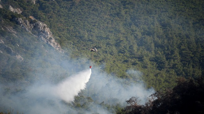 İzmir'in Menderes ilçesinde ormanlık alanda çıkan yangına ekiplerin havadan ve karadan müdahalesi sürüyor.
