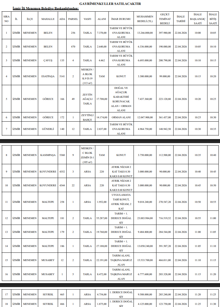 GERÇEKİZMİR - Menemen Belediye Başkanlığı bünyesinde bulunan toplam 35 taşınmazın satışı için ihaleye çıkmaya karar verdi.