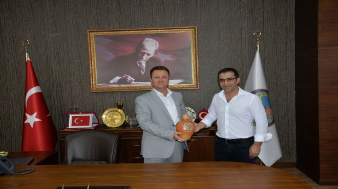 Başkan Mustafa Sarıgül’e Menemen’in ünlü testisini ve Kubilay’ın küçük büstünü de hediye eden Başkan Aksoy, nazik ziyaretlerinden dolayı kendisine teşekkür etti.