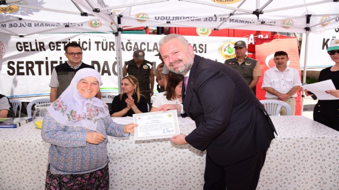 İzmir Orman Bölge Müdürlüğü tarafından düzenlenen "Gelir Getirici Tür Ağaçlandırması" projesi kapsamında Menemen’in İğnedere Mahallesi'nde 10 dekarlık bir alanda 2017 yılında dikilen 3 bin zeytin ağacı, 34 çiftçiye düzenlenen sertifika töreni ile dağıtıldı.