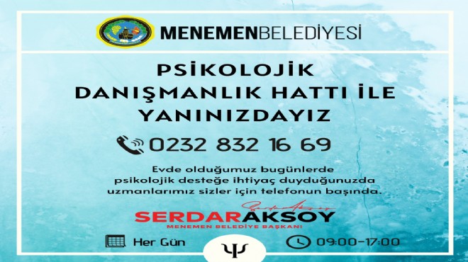 Tüm dünyayı etkisi altına alan Koronavirüs nedeniyle evlere kapanmak, salgın riski ile baş etmek ve yaşanan bilgi kirliliği nedeniyle zor zamanlar geçirmek zorunda kalan Menemenlilerin imdadına Menemen Belediyesi yetişti. Belediye bünyesinde kurulan Psikolojik Danışmanlık Hattı’nda görev yapan iki uzman psikolog, arayan herkesin sıkıntılarını dinleyecek ve rahatlatıcı tavsiyelerde bulunacak.