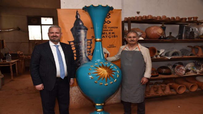 Menemen’de 45 yıldır çömlekçiliğe can veren Kültür ve Turizm Bakanlığı Çömlek Sanatçısı Ahmet Taşhomcu, Cumhurbaşkanı Recep Tayyip Erdoğan’ın 26 Kasım 2021 tarihinde Menemen’e yapmış olduğu tarihi ziyareti el emeği eseriyle taçlandırmak istedi. Bu fikrini de Menemen Belediye Başkan Vekili Aydın Pehlivan ile paylaştı. 1 aylık kısa bir zamanda 2.5 metre uzunluğunda dev bir vazo yapan Taşhomcu, eserinin hikayesini Menemen Belediye Başkan Vekili Pehlivan ile birlikte anlattı.