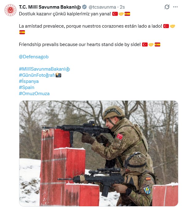 Bakanlık X hesabından yapılan paylaşımda “Dostluk kazanır çünkü kalplerimiz yan yana” ifadesi kullanılarak bir tatbikat fotoğrafı paylaşıldı. Bir Türk askeri ile bir İspanyol askerinin yan yana nişan alırken çekilen fotoğraflı paylaşım yaklaşık 4 bine yakın beğeni aldı.