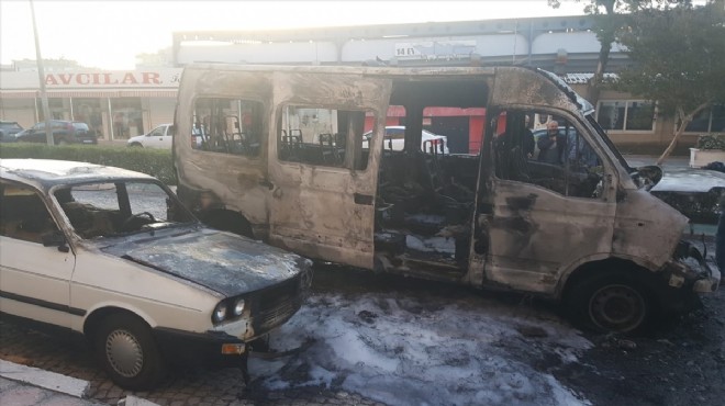İzmir'in Bergama ilçesinde minibüste çıkan yangın, park halindeki iki otomobilde de hasara yol açtı.