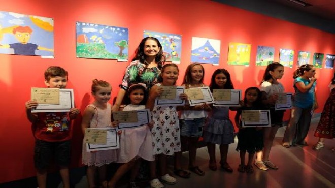 Minik kursiyerlere sertifikaları Folkart Gallery Genel Koordinatörü Fahri Özdemir ve ressam Hale Gökalp Sezer verdi. (DHA)
